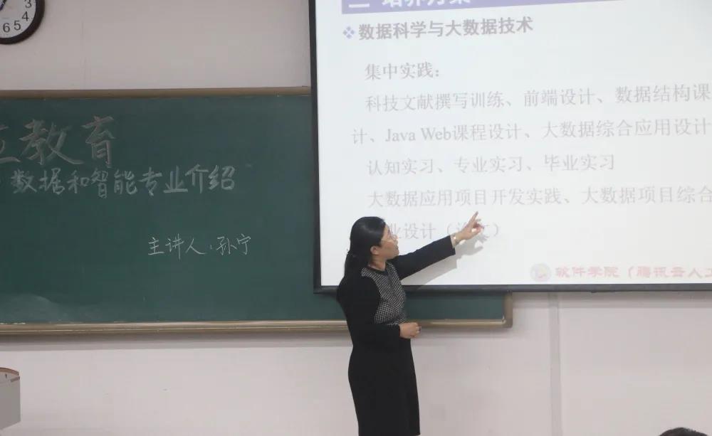 孙宁老师从专业介绍、人才需求、培养方案和教学条件等四个方面为同学们讲解数据科学与大数据技术专业。通过举例,孙老师生动形象地向同学们诠释了大数据专业的价值和力量,同时强调了“发现规律和预测未来”是本专业的核心能力,这也代表了大数据的专业前景是无可限量的。