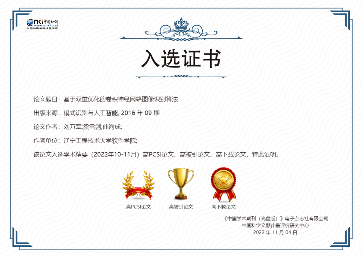 刘万军教授团队两篇文章“不同池化模型的卷积神经网络学习性能研究”发表于《中国图象图形学报》(2016年第9期)和“基于双重优化的卷积神经网络图像识别算法”发表于《模式识别与人工智能》(2016年第9期),同时入选高被引论文、高下载论文和高PCSI论文。其中“不同池化模型的卷积神经网络学习性能研究”的文献总被引频次在“自动化技术”领域排名前0.1%(4/37505),在“计算机软件及计算机应用”领域排名前0.1%(8/58555)。
