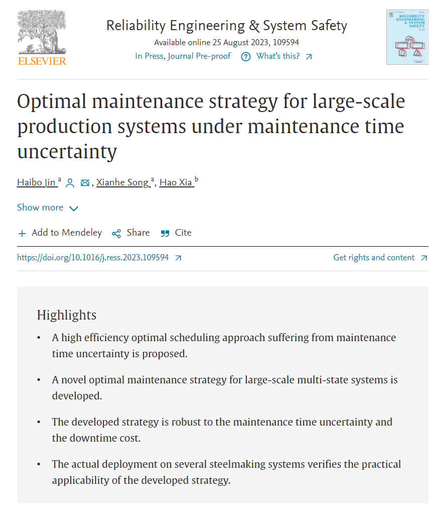 金海波副教授与硕士研究生宋宪鹤一篇高水平研究论文被中科院1区Top期刊《Reliability Engineering & System Safety》录用,目前已完成proof工作。