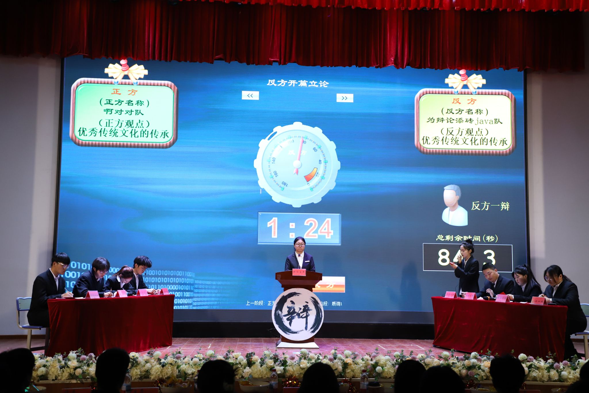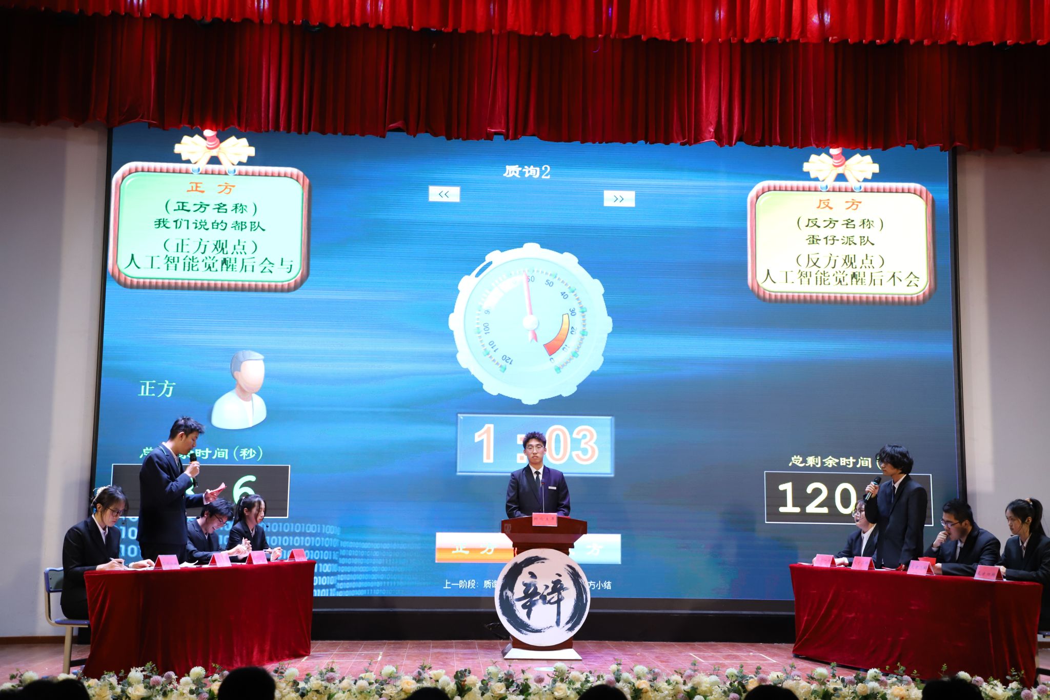 比赛伊始,辩手们迅速进入状态,围绕“人工智能觉醒后能否与人类共存”和“传统文化应该注重原汁原味还是创新发展”两大辩题展开了一场场扣人心弦的思想交锋。正方选手通过严谨的逻辑论证和生动案例,在赛场上先声夺人;而反方辩手则另辟蹊径,从人文关怀的角度进行了有力反击。双方辩手犀利的观点引得现场观众的阵阵思考。自由辩论环节将比赛推向高潮,双方你来我往、互不相让。既有对专业知识的深度剖析,又融入了对社会现象的独到见解,也不时穿插幽默风趣的表达,引得现场掌声、笑声不断。