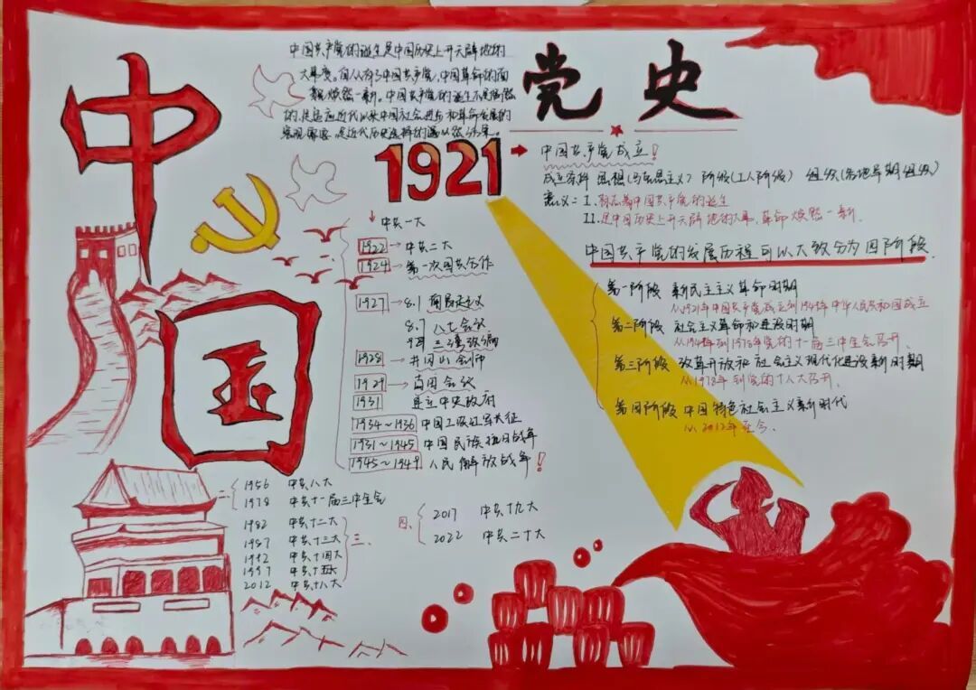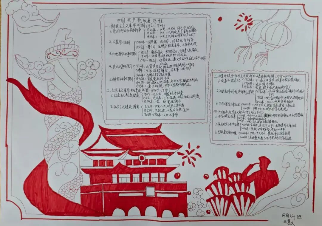 从1921年建党的开天辟地壮举起笔,新民主主义革命的烽火征程在纸上熊熊燃烧,社会主义革命与建设的探索足迹清晰可循,改革开放的浪潮奔涌向前,新时代的伟大跨越气势恢宏。中共一大的曙光初现、万里长征的坚韧跋涉、新中国成立的开国立业、改革开放的春风浩荡,再到党的二十大开启的崭新征程…… 。重要会议的思想闪光、关键战役的热血担当、发展阶段的历史跨越,都在同学们的创作中一一铺展,化作生动的党史知识深深地烙印在大家的脑海中。