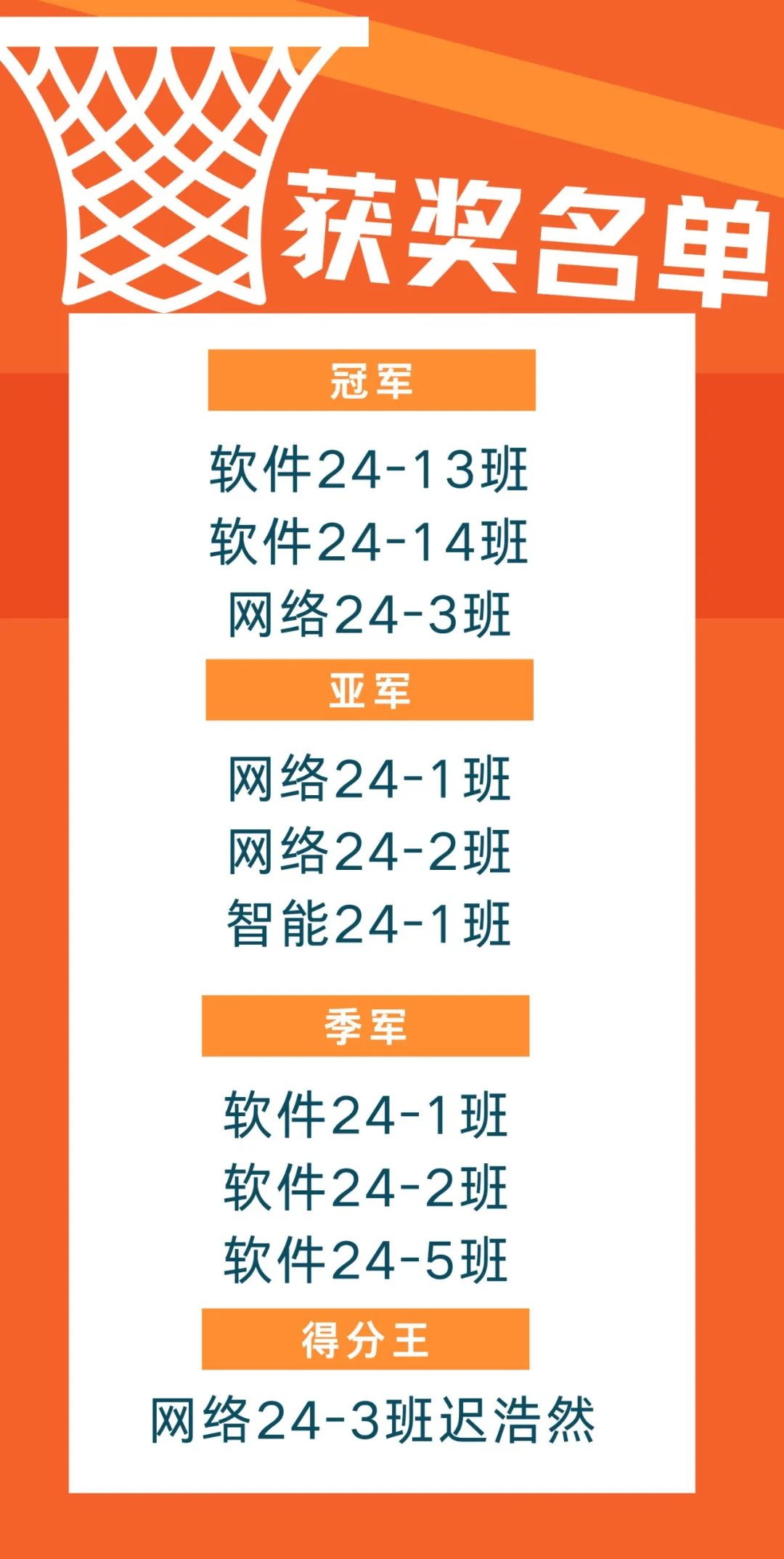 2024级新生篮球赛最终获奖情况如下:
