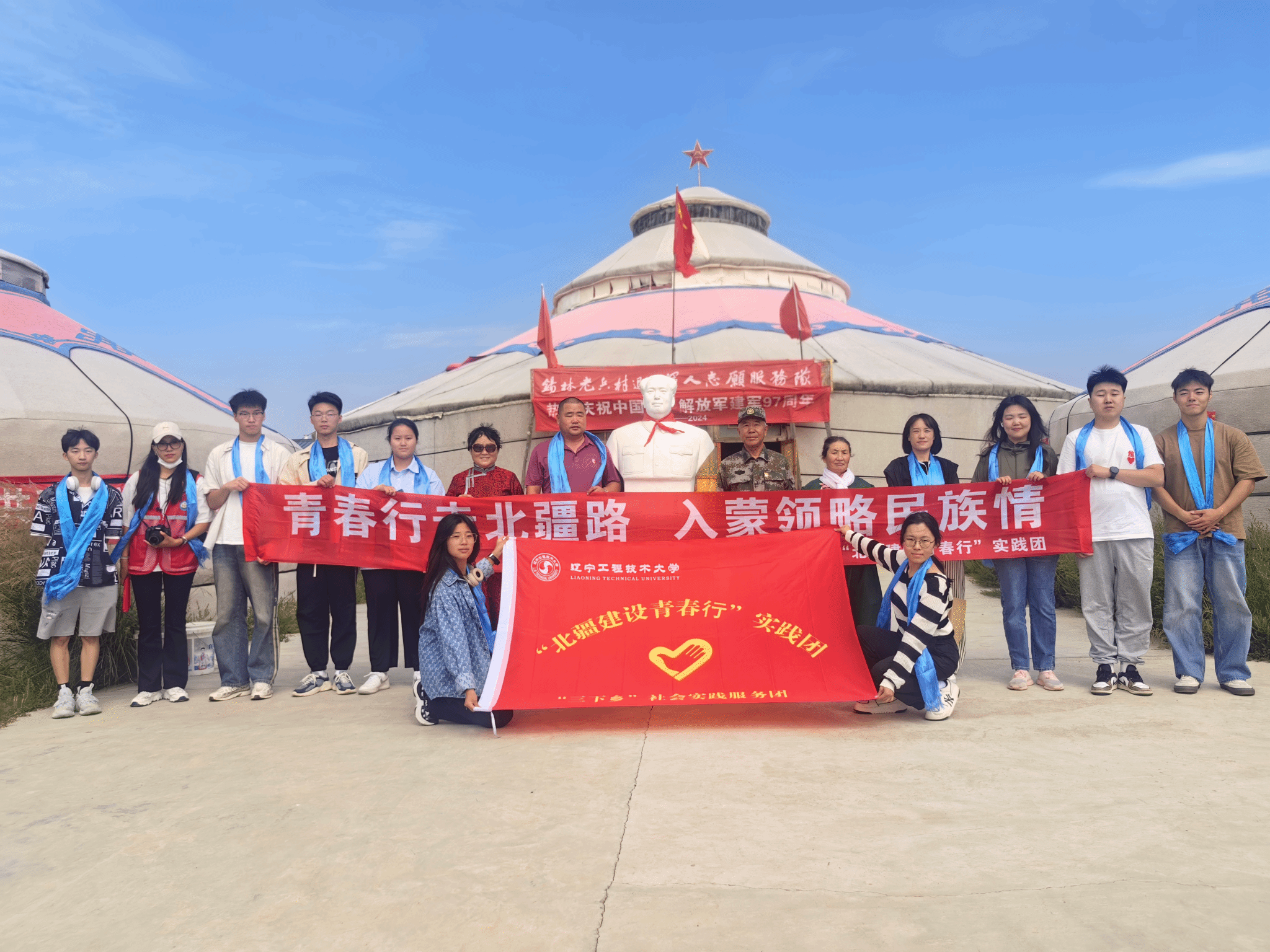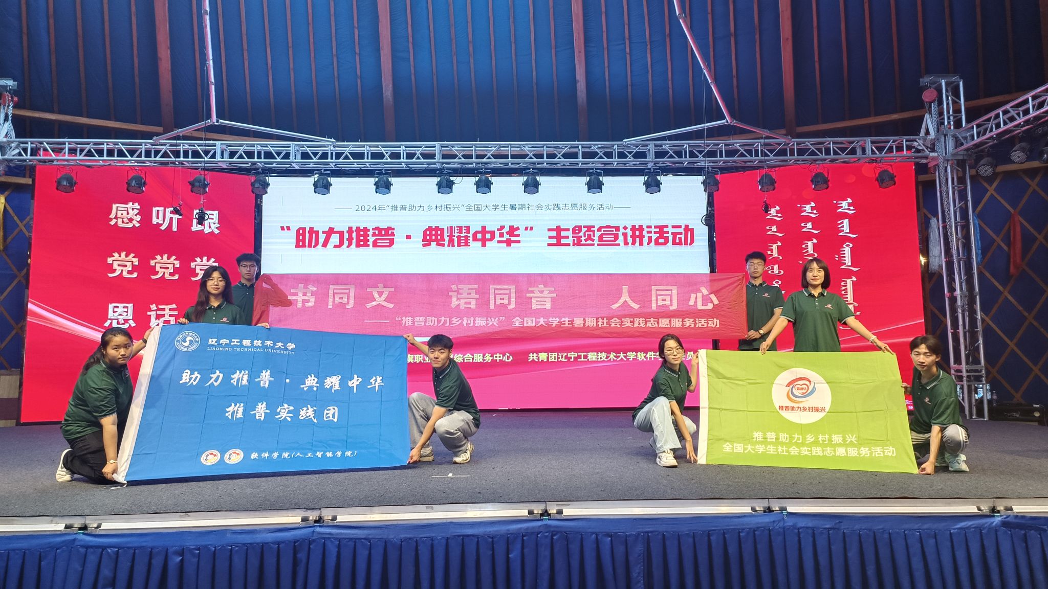 和校团委联合指导,团队积极响应国家政策号召,以贯彻落实党的二十大关于“加大国家通用语言文字推广力度”决策部署为使命,奔赴内蒙古锡林郭勒盟阿巴嘎旗开展实践活动。实践团先后深入内蒙古锡林郭勒盟阿巴嘎旗多地开展调研访谈,精心设计并发放推普助力乡村振兴调查问卷千余份。通过“弘扬文化经典,传承中国画韵”“品鉴经典阅读,感悟诗词之美”“探索汉字之魂,传承文化之韵”等活动,帮助民众学习普通话、传承优秀文化。这些活动有效促进了文化交流,增强了民众对普通话的认同感和学习热情,实践团还根据调研情况提出8条资政建议,并被当地团委采纳。实践团还深入偏远牧区,与64位牧民进行访谈交流,感悟戍边精神。他们寻访了“全国模范退役军人”哈斯巴特,参观了锡林老兵村退役军人志愿服务队基地和边防骑兵连民兵连部,举办了“国旗耀边关”主题活动,深刻感悟并弘扬戍边精神的同时,积极为铸牢中华民族共同体意识、维护国家安全贡献青春力量。实践团共制作戍边宣传视频12个。