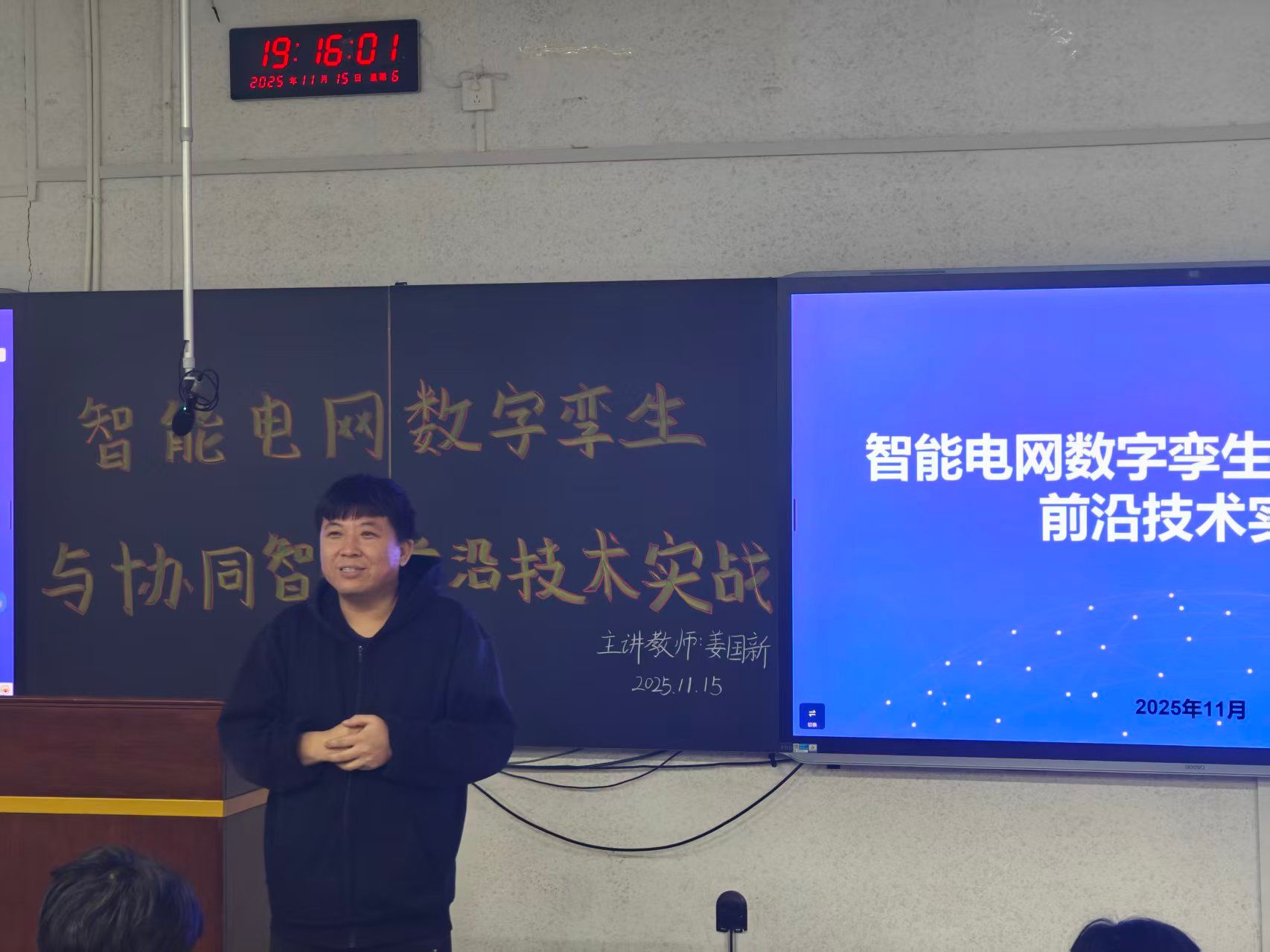 讲座伊始,姜国新老师以全球能源互联网和新型电力系统建设为宏观背景,深入浅出地阐述了智能电网作为未来能源体系核心枢纽的重要性。他指出,随着物理电网与数字空间的深度融合,数字孪生技术为电网的规划、运行、维护和优化提供了前所未有的可视化、可分析和可预测能力,而协同智能则能使电网实现更高效、安全与自愈的运行模式。